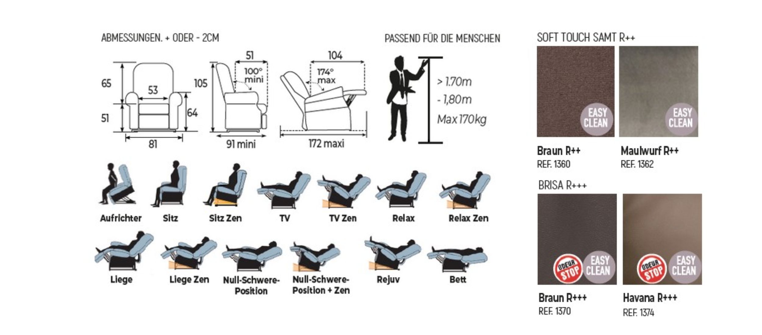 | Verstelloptionen: | Aufstehfunktion, Bett-Position, Liege-Position, Liege Zen, Null-Schwere-Position, Null-Schwere-Position + Zen, Rejuv, Relax-Position, Relax Zen, Sitz-Position, Sitz Zen, TV-Position, TV Zen |
