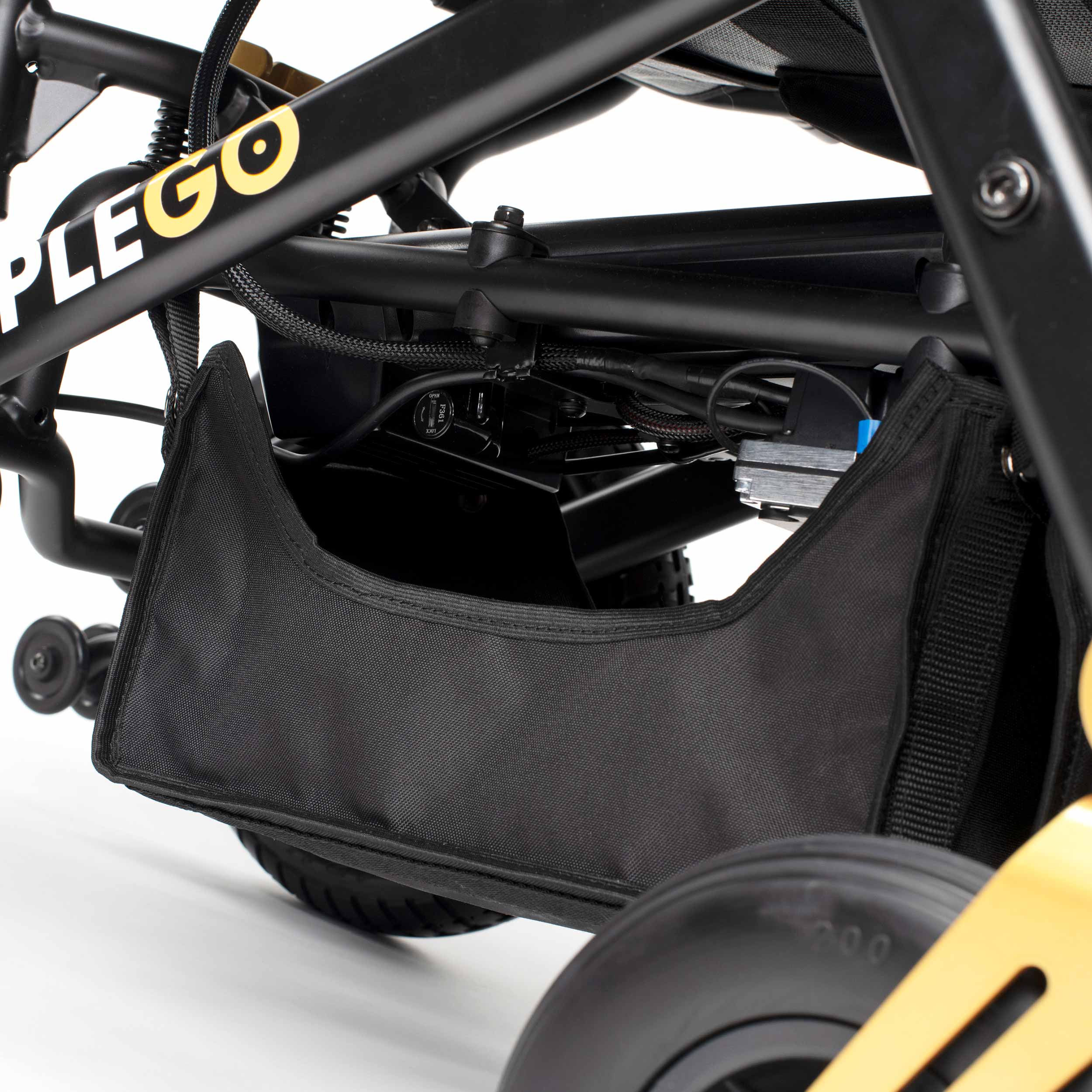 Praktischen Stauraum bietet der Rollstuhl mit einer Standardtasche an der Rückseite. Deutlich mehr Platz zum Unterbringen von Einkauf oder Ersatzakkus erhalten Sie mit der optionalen Tasche für unter den Sitz, die Sie zusätzlich mitbestellen können.