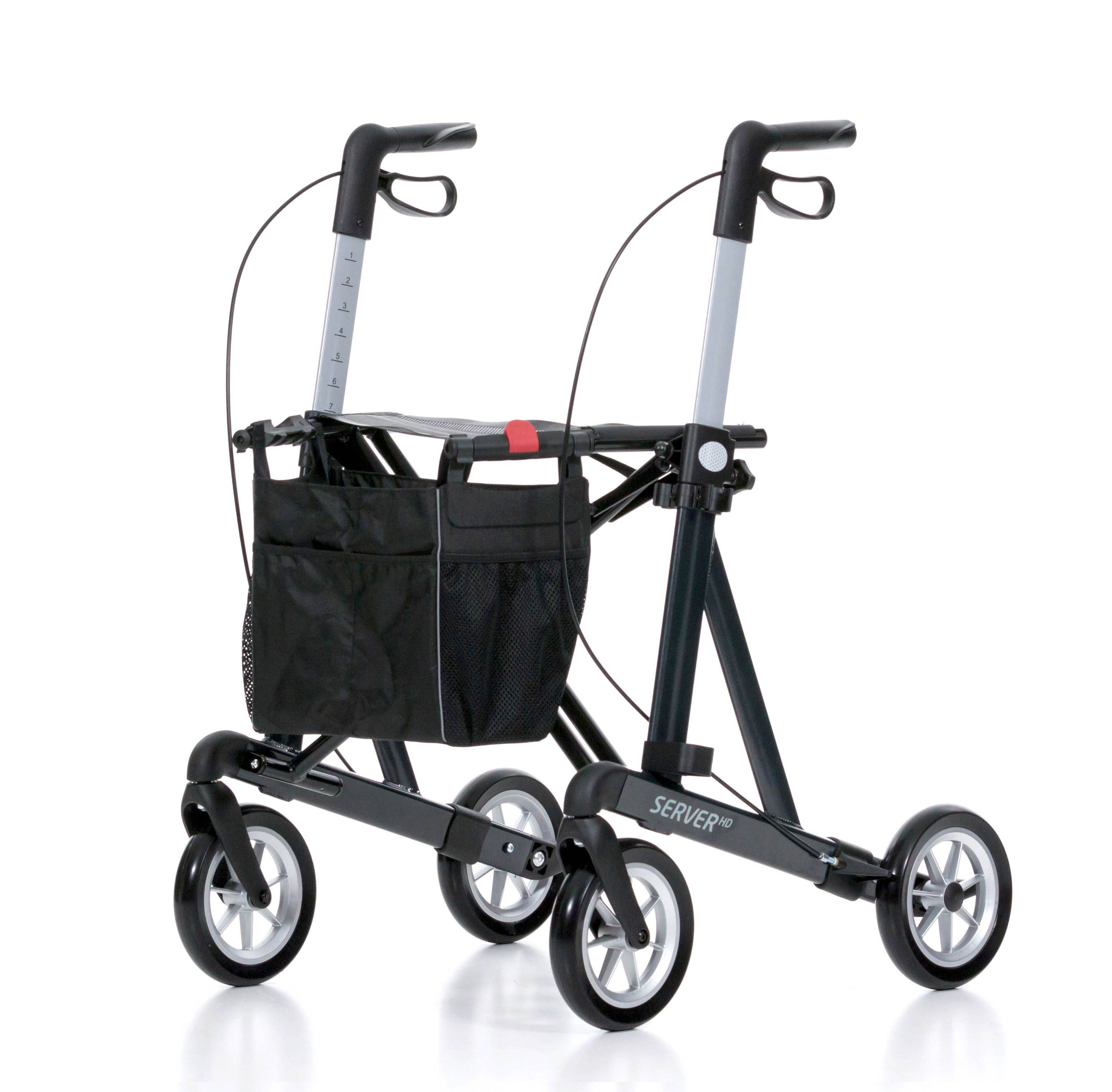 La construction du Server HD permet de marcher debout en toute sécurité. Les poignées ergonomiques et confortables sont réglables en hauteur en 10 étapes, de sorte que vous pouvez faire des réglages idéaux pour votre taille. Le déambulateur léger est facile à pousser et lorsqu'il n'est pas utilisé, il peut être rabattu pour économiser de l'espace pendant le transport ou le stockage. Le verrouillage de l'appareil empêche toute réouverture involontaire. En déplacement, le sac pratique offre un espace de rangement pour les courses ou les objets personnels (max. 5 kg). A l'aide de clips de fixation, le sac, qui mesure 35 x 17 x 25 cm (L x P x H), peut être facilement fixé ou retiré. Des accessoires supplémentaires pour le Server HD sont disponibles en option.
