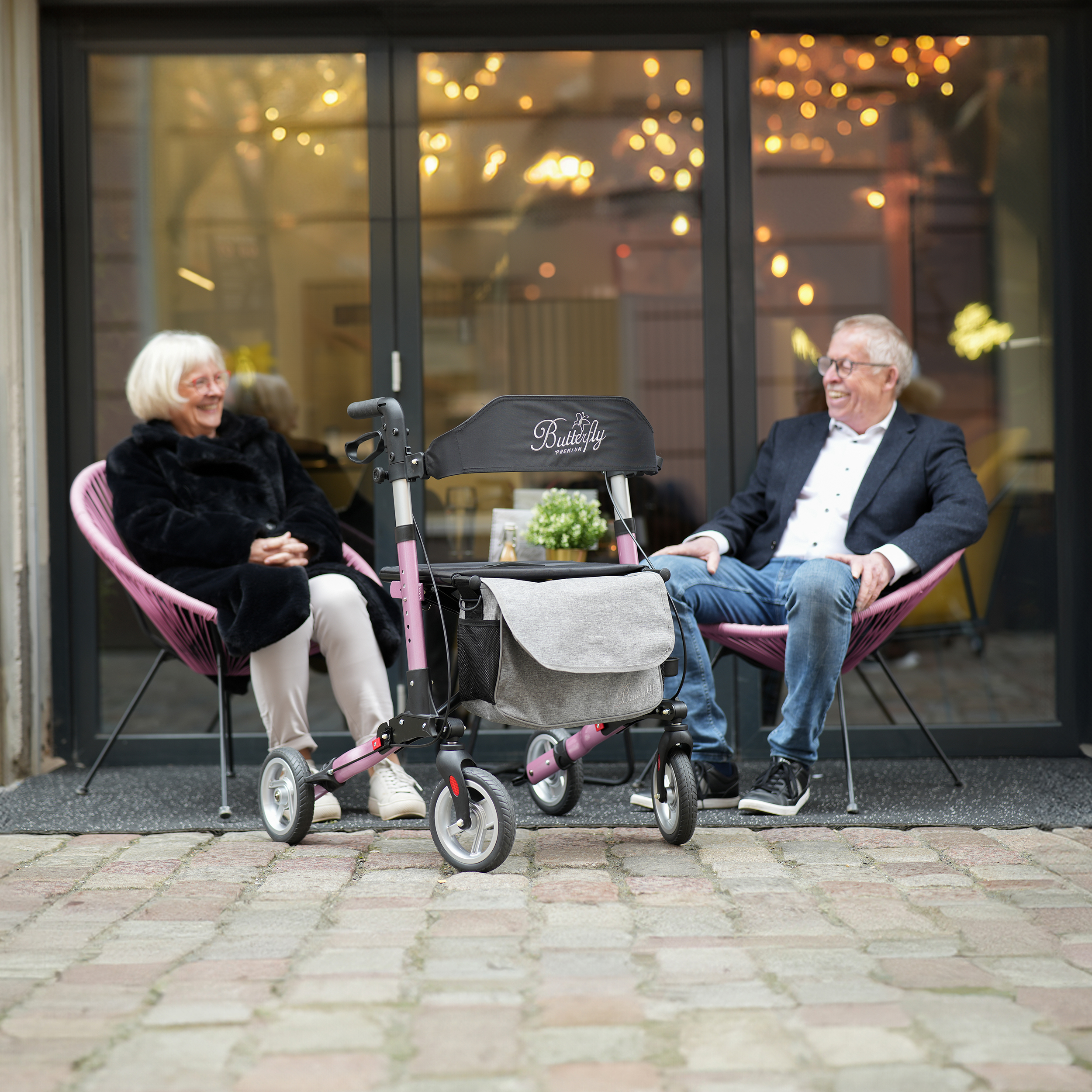 Un déambulateur attrayant est l'expression de la joie de vivre et de l'individualité. C'est pourquoi nous avons accordé une attention particulière au design du déambulateur Butterfly Premium, en plus de sa fonctionnalité : Vous avez le choix entre quatre couleurs attrayantes pour le châssis du déambulateur aux formes élégantes. Ainsi, vous faites toujours bonne figure avec votre aide à la mobilité. Le logo Butterfly est brodé sur la poche et sur la ceinture dorsale.