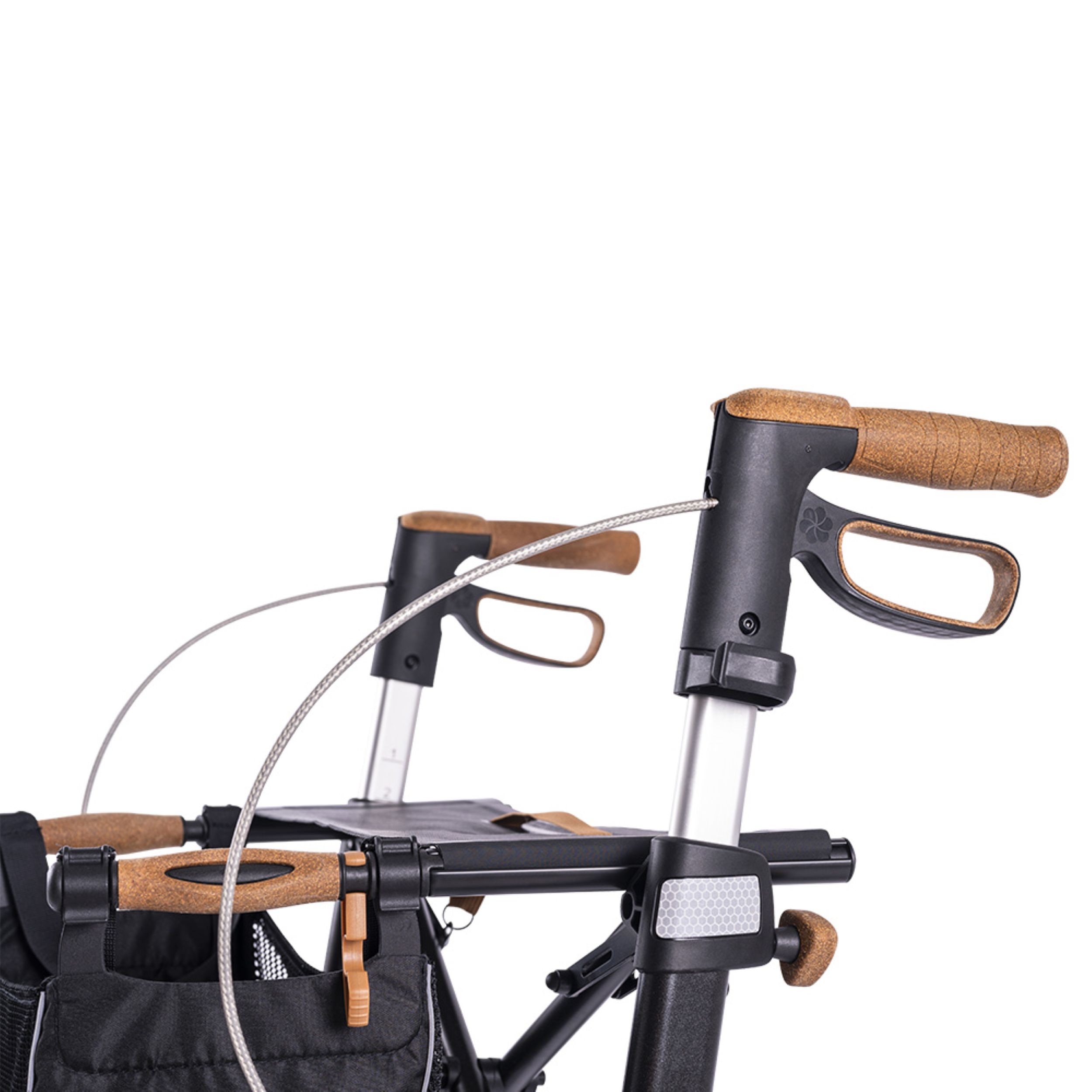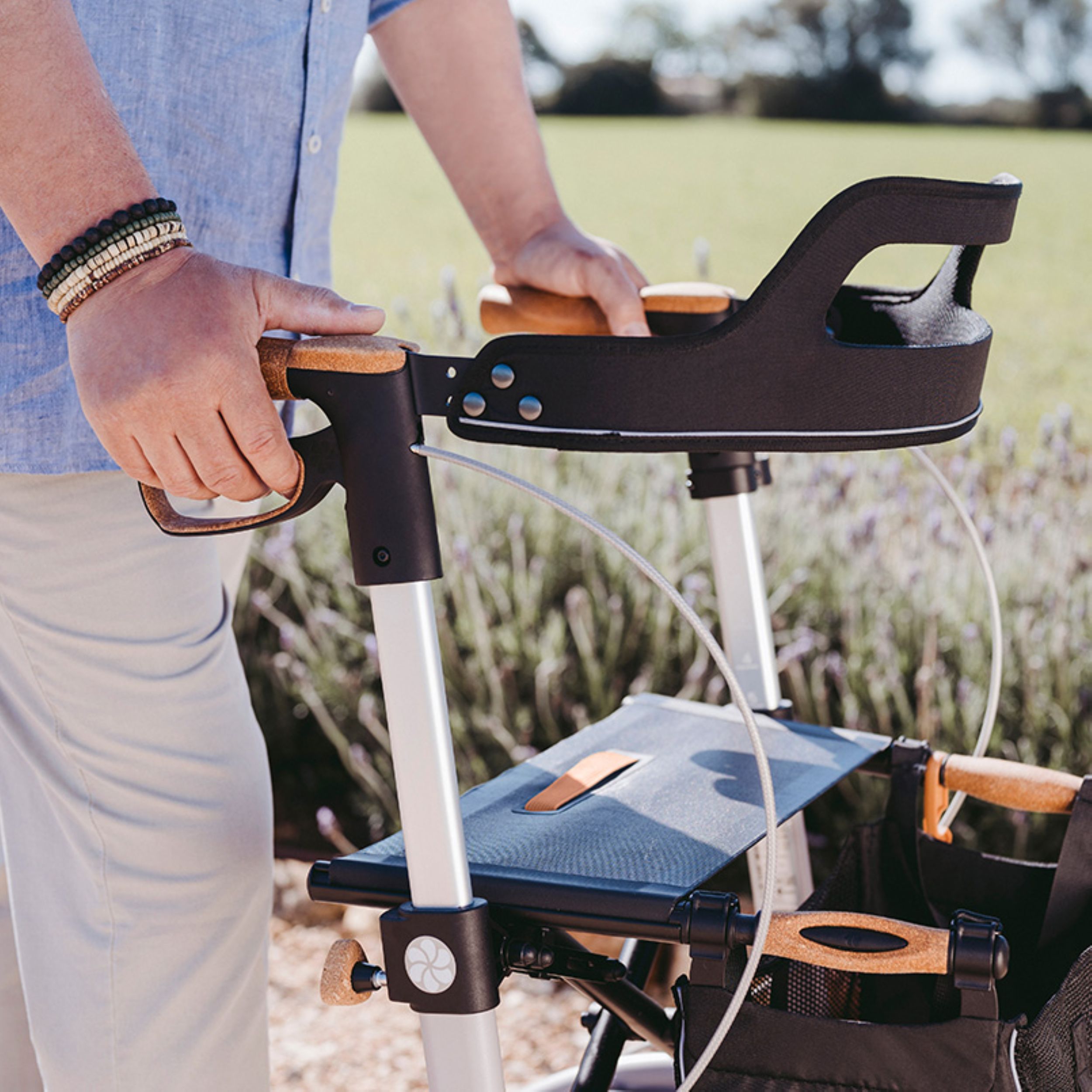 Malgré sa légèreté, le confort reste la priorité. Les poignées réglables en hauteur sont fabriquées en liège-TPE, un matériau doux pour la peau, antidérapant, amortissant et thermorégulateur. Les larges accoudoirs évitent les points de pression sur les avant-bras lorsque vous êtes assis. Ces éléments en liège confèrent au SALJOL un look unique, loin de l'aspect purement médical des déambulateurs classiques.