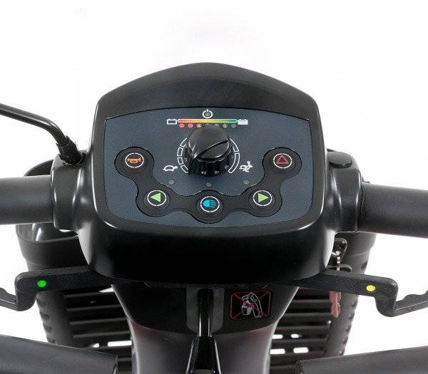 Le scooter d’INVACARE peut être démonté rapidement et sans outils. Ainsi vous pouvez facilement ranger le véhicule électrique dans le coffre de votre voiture. De nombreuses possibilités de réglage augmentent votre confort de conduite : Outre le siège pivotant avec un dossier rabattable, la colonne de direction peut également être réglée individuellement pour vous permettre d’accéder facilement au panneau de commande. Les touches mises en évidence, et l’indicateur de charge, sont facile d’utilisation, chaque pression est confirmée par un signal sonore (tonalité d’acquittement). Le conducteur est également prévenu par un avertissement acoustique lorsque le niveau de la batterie est faible. Bien entendu, le niveau de charge peut également être lu visuellement à tout moment.
