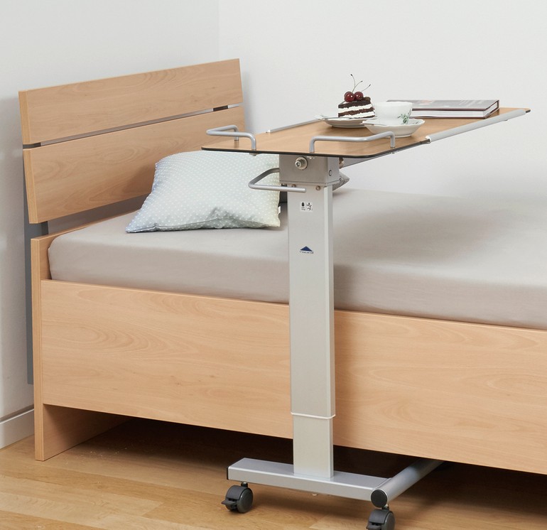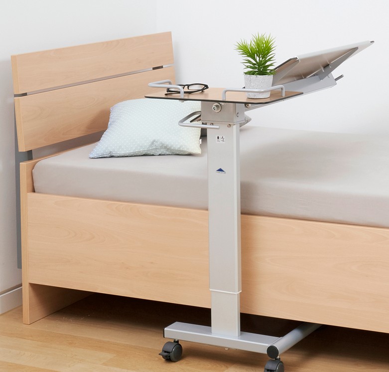 Imaginez que vous ayez posé un verre d'eau pour la nuit sur la table de chevet à côté de votre lit. Le matin, encore somnolent, vous relevez votre lit médicalisé pour vous lever plus facilement. Avec une table de chevet classique qui dépasse au-dessus de votre lit, vous risqueriez de vous cogner la tête.