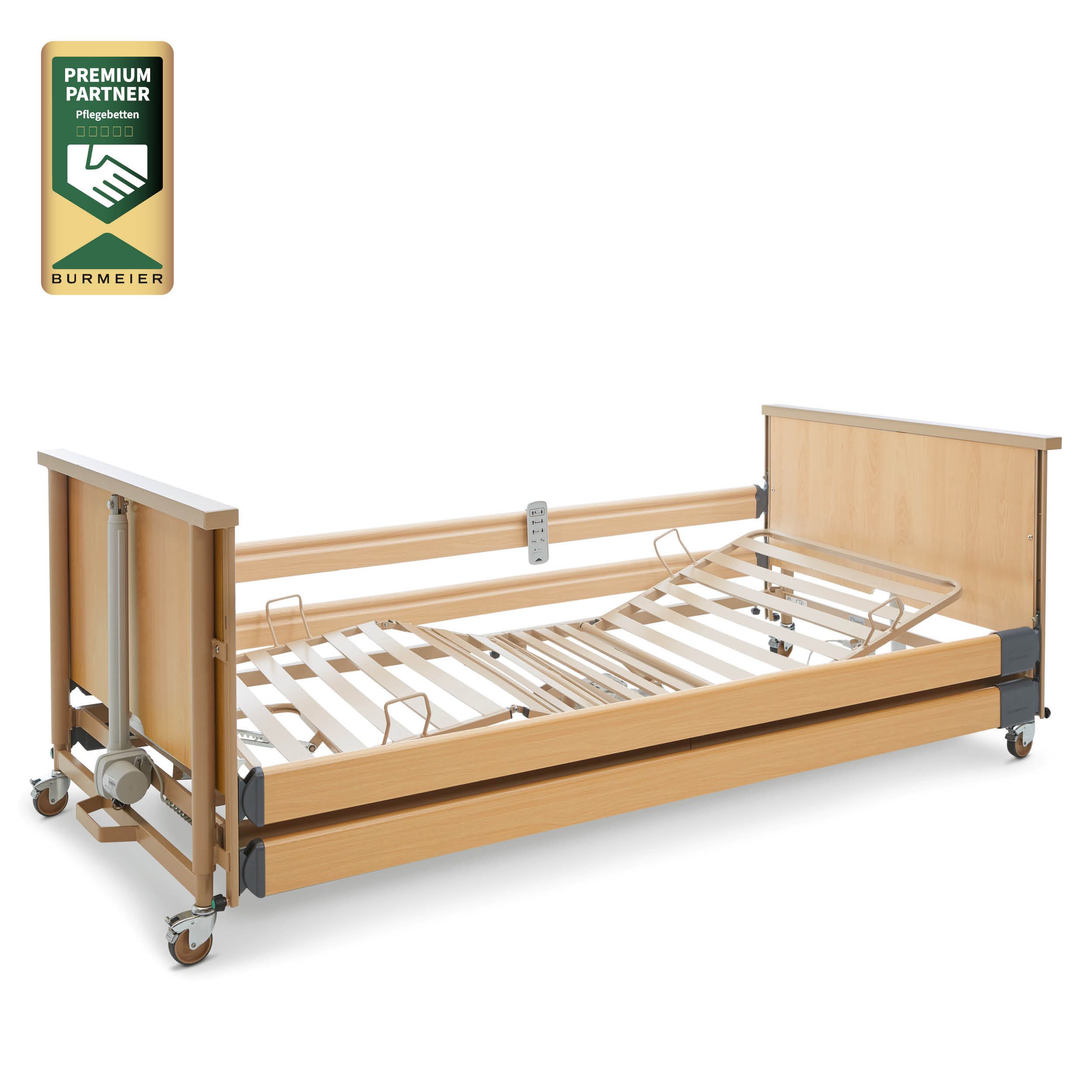 Seitensicherungen schützen vor Stürzen – doch wenn sie per - manent hochgezogen werden, kann diese freiheitsentziehende Maßnahme die Lebensqualität des Pflegebedürftigen senken. Eine hervorragende Alternative sind Niedrigbetten wie das Dali low -entry. Mit seinem Höhenverstellbereich von 23 bis 63 cm befindet es sich in der tiefsten Position dicht über dem Fußboden. Aus dieser niedrigen Höhe ist das Verletzungsrisiko des Bewohners im Fall eines Sturzes viel geringer. Das erleichtert die Entschei - dung, auf Seitensicherungen zu verzichten. So folgt Burmeier der Philosophie des Werdenfelser Weges, die Mobilität des Bewoh - ners zu erhalten.